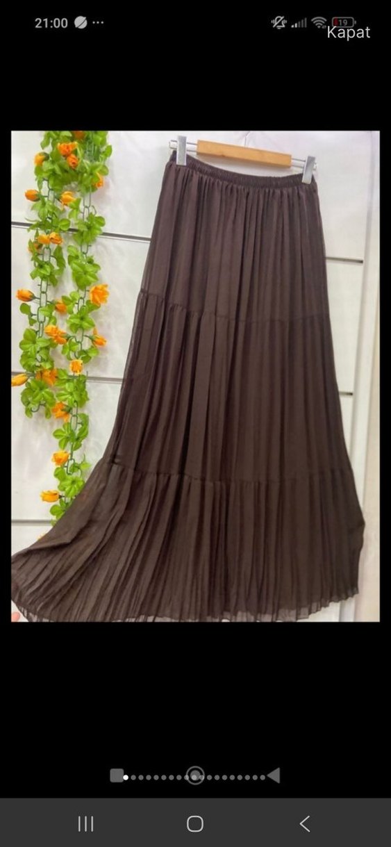 Kahverengi uzun etek, piliseli ve bol kesimdir. Yumuşak sentetik kumaştan üretilmiş, bohem tarzına uygundur ve desensizdir.