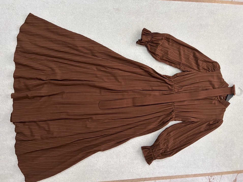 Kahverengi piliseli uzun elbise, bol kesim ve kayık yaka ile. Parlak sentetik kumaştan, askılı kolları ve vintage bohem tarzıyla günlük kullanıma uygundur.
