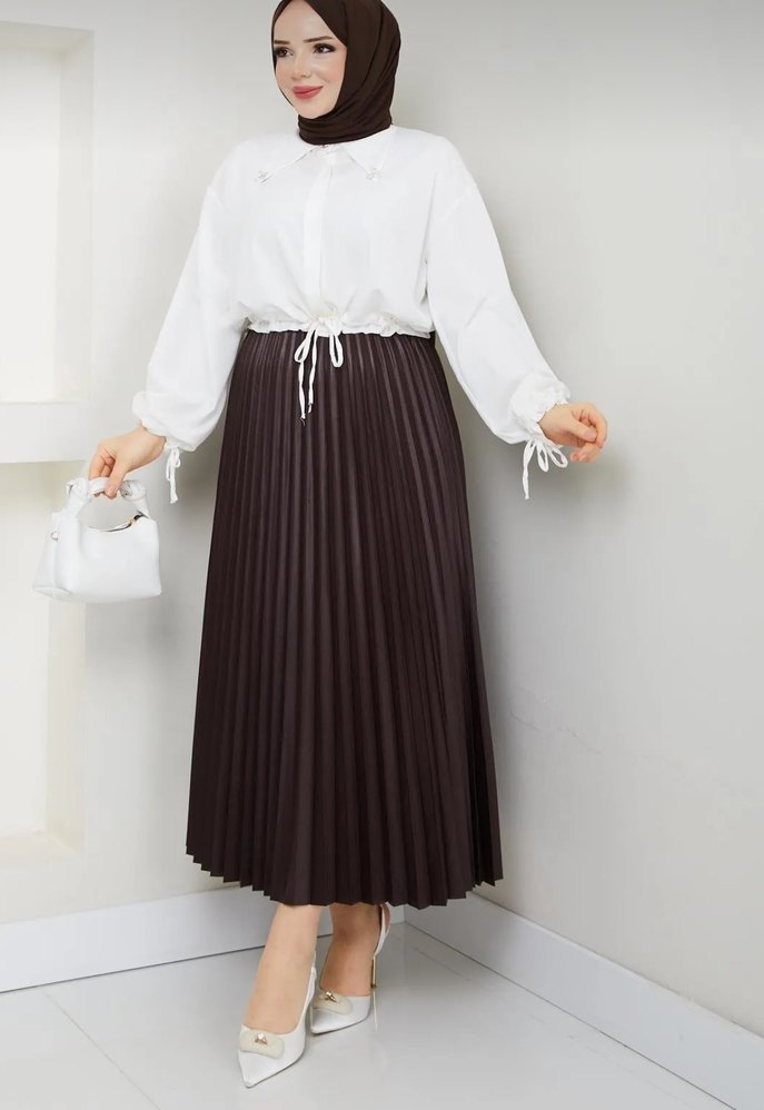 Kahverengi tie-dye desenli, piliseli ve bol kesim uzun kadın eteği. Sentetik kumaştan üretilmiş, günlük şık kullanıma uygundur.