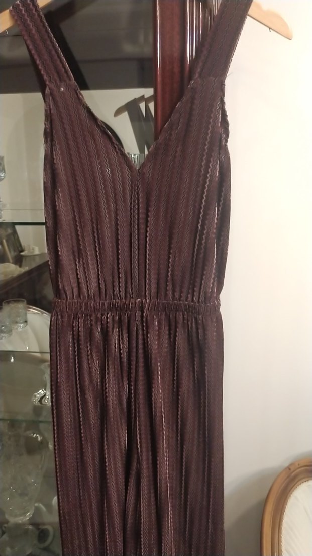 Kahverengi, piliseli, V yaka ve kolsuz uzun tulum, bohem vintage tarzında, romantik akşamlar için uygundur. Yumuşak sentetik kumaştan üretilmiştir.
