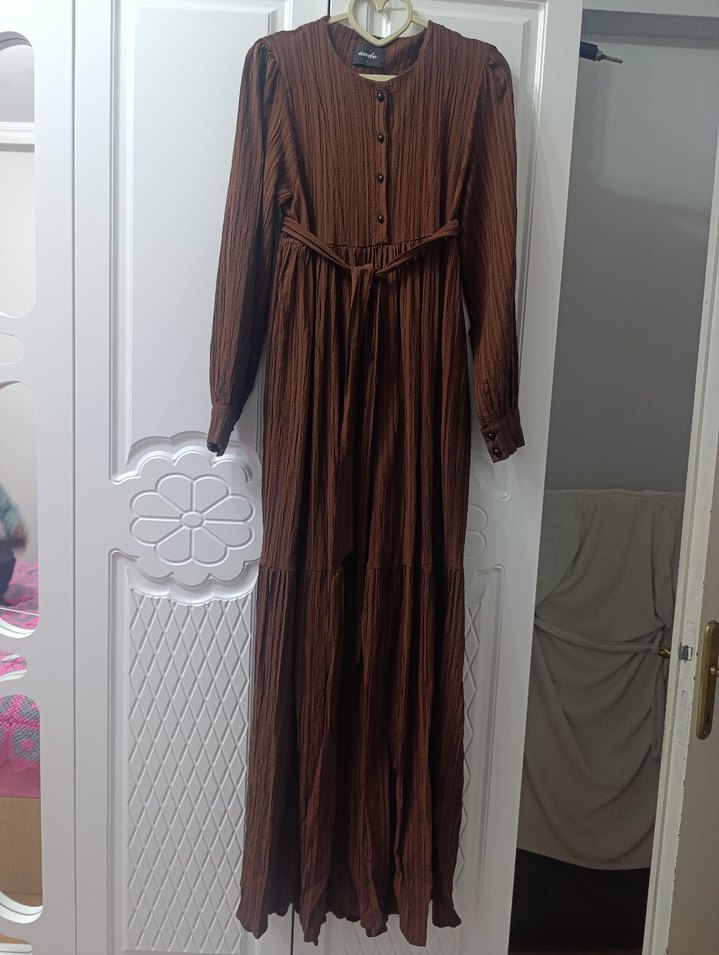Bu kahverengi uzun elbise, yüksek yakalı ve piliseli tasarıma sahiptir. Yumuşak keten kumaştan, bol kesim ve ince askılıdır, bohem tarzını yansıtır. 1 beden s-m giyebilir kemerli