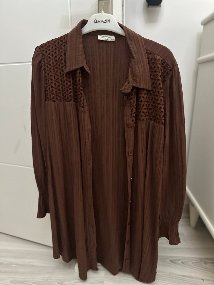 Kahverengi Piliseli Uzun Kollu Kadın Gömlek