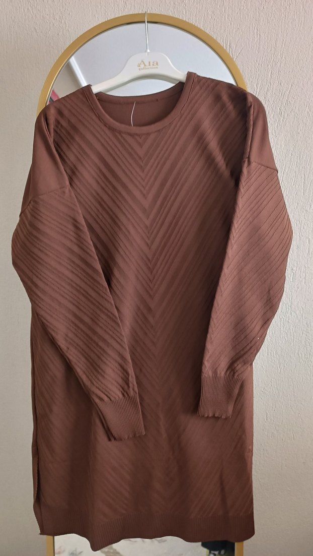Kahverengi piliseli dokulu, yuvarlak yaka ve uzun kollu keten tunik. Rahat kesimi ve uzun boyu ile minimalist günlük stil için uygundur.