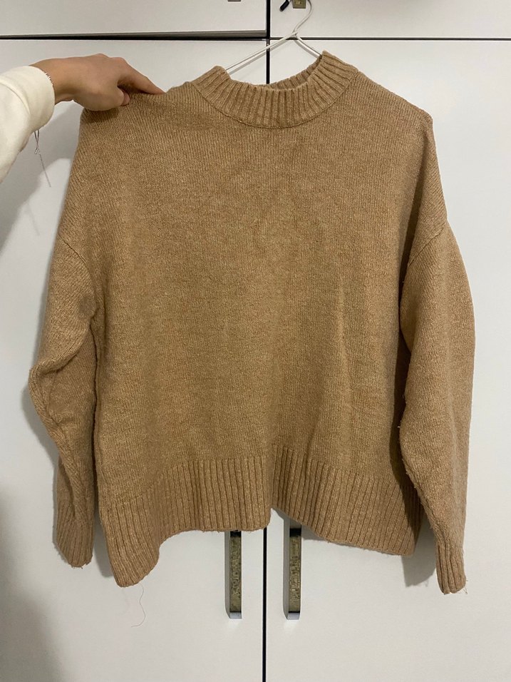 Kahverengi, yuvarlak yakalı ve uzun kollu,kazak. Rahat kumaşıyla günlük kullanıma uygun, trend görünümlü.