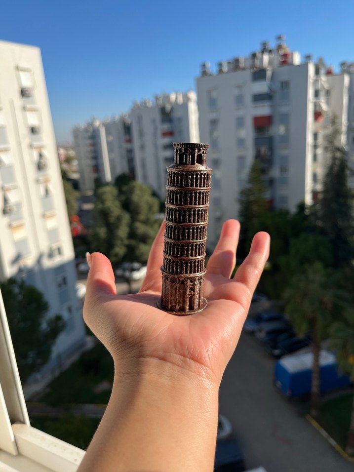 Parlak kahverengi figür, Pisa Kulesi'nin detaylı mimarisini yansıtıyor. Avuç içine sığacak boyutta. Ürün 3D printer ile basılmış olup malzemesi PLA dır. Baskı işleminden sonra akrilik boya ile boyanmış ve verniklenmiştir.