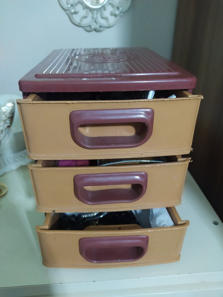 Kahverengi plastikten yapılmış, üç çekmeceli ve kulplu, üstü düz organizer. ️az kulanildi göründüğü gibidir hiç bir sorunu yoktur dileğiniz yerde kullanılabilirsiniz