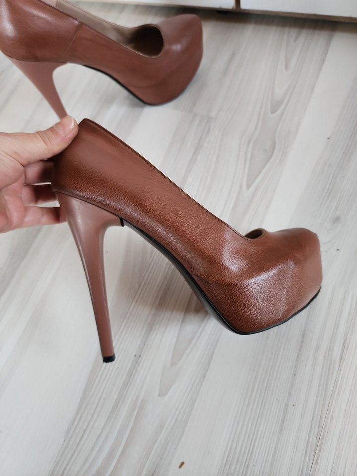 Kahverengi platform topuklu ayakkabı topuk boyu 13 buçuk ön platformu 4 cmdir 1 kere kullanıldı tertemiz yeniden farksız açık kahverengi isteyen siyaha boyasada olur duruşu çok şık marka temsili