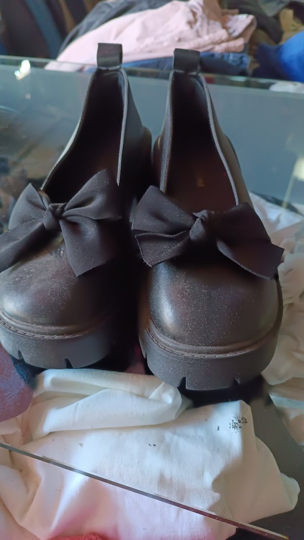 Kahverengi platform topuklu, fiyonklu gotik tarzda kadın ayakkabısı, kauçuk malzemeden, günlük kullanım için uygun.
