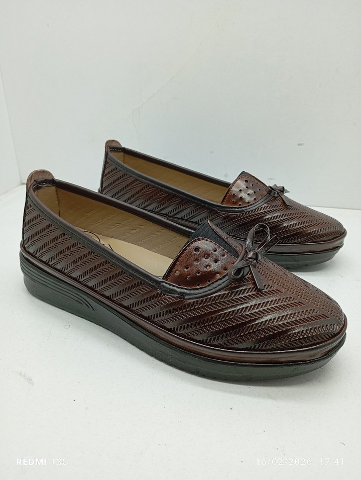 Kahverengi platform topuklu kadın babet, plise desenli ve yılan derisi desenli kauçuk malzeme. Günlük kullanıma uygun klasik tarz.
