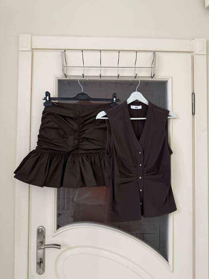 Kahverengi, keten kumaştan yapılmış, pliseli ve dar kesim mini etek. Ve bluz. Sokak modası ve günlük kullanım için uygundur, Paris tarzını yansıtır.