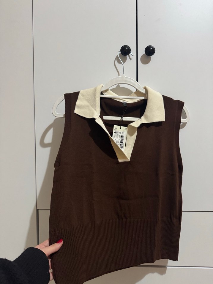 Kahverengi, polo yaka, kolsuz, bol kesim kadın süveter. Pamuklu, örme kumaştan ve baskılı desene sahip. Günlük sokak stili için uygun.