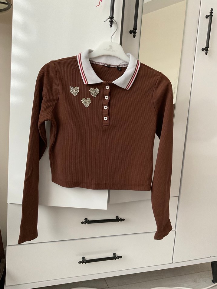 Kahverengi polo yaka Uzun Kollu Düğmeli Bluz- crop