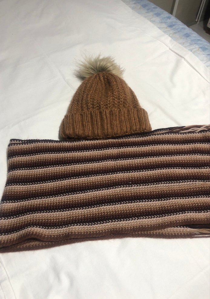 Yumuşak dokulu kahverengi örgü kadın bere, sahte kürk ponponuyla rahat ve bohem tarzda bir görünüm sunar. Atkı ise 200 cm Uzunluğundadır o çipleri Harish bu boydadır şapkaya uyumlu olarak kullanmaktadır çok az kullanıldı herhangi bir problemleri yoktur Şapka LC Waikikidir
