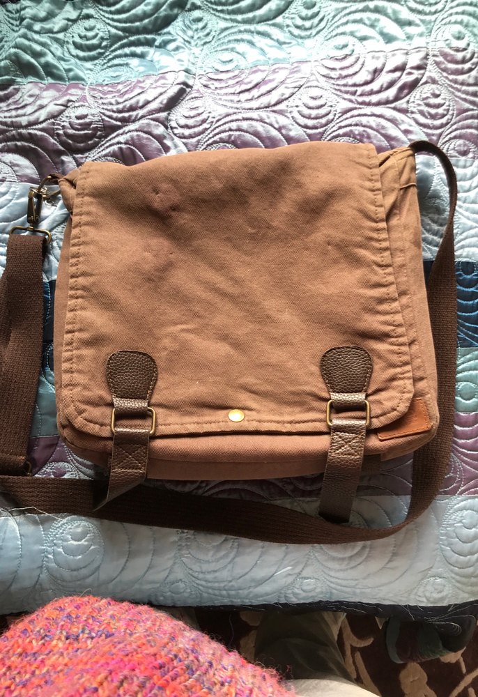 Tokalı kayışlara ve ayarlanabilir omuz askısına sahip kahverengi erkek postacı çantası, vintage ve retro tarzda. Görüldüğü gibi minik lekeler var, boya lekeleri. Boyu yaklaşık 30 eni 35 cmdir.