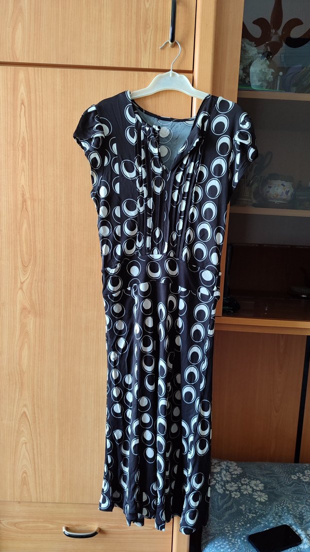 kahverengi uzun elbise, düğmeli ve kısa kolludur. Gevşek kesim ve pilili detaylara sahiptir. Retro tie-dye deseni ile gotik ve avangart tarzı yansıtır. düğmeyi kapatan ip kopuk