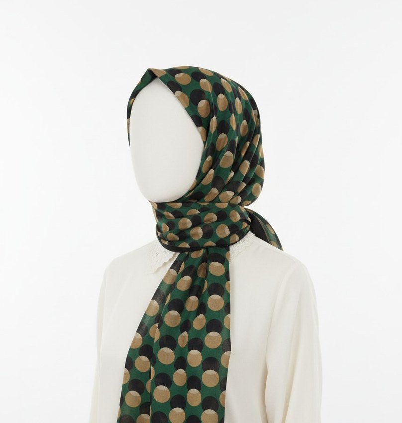 Koyu kahverengi puantiyeli, dökümlü tasarıma sahip kadın şalı. Yumuşak sentetik kumaştan, minimal ve modern stil.