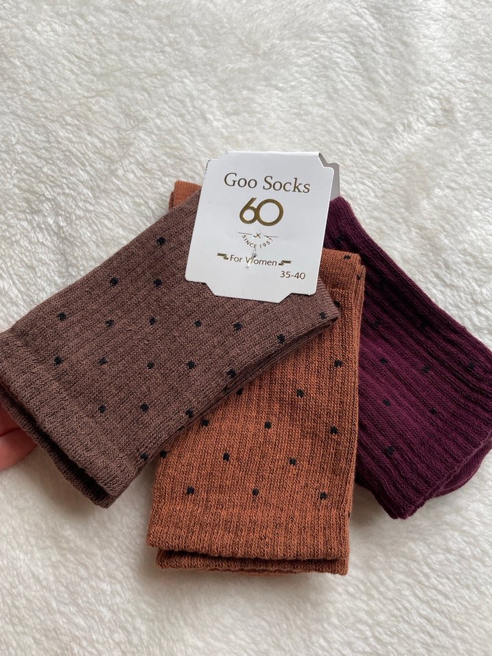 Koyu kahverengi, puantiyeli, örme kız çorabı, 35-40 numara, Goo Socks markası. Rahat ve sıcak tutar.