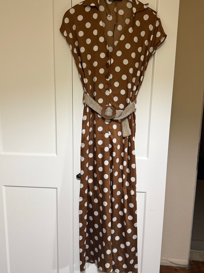 Kahverengi, parlak puantiyeli, kuşaklı uzun zara marka saten tulum. Askılı kol ve yakalı, bol kesim, saten kumaştan, vintage bohem tarzında.