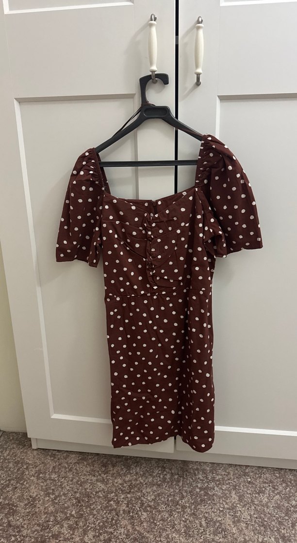 Dar kesim midi elbise, kısa kabarık kollu, V yaka ve düğmeli detaylara sahiptir. Kahverengi kumaş üzeri beyaz puantiyelerle bohem tarzda vintage görünüme sahiptir.