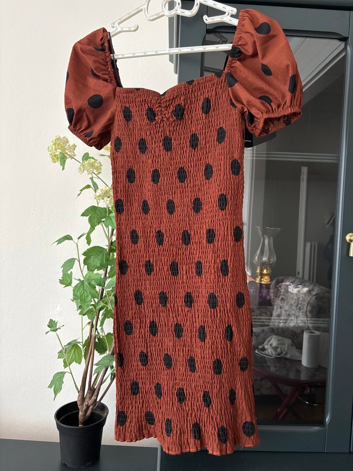 Kahverengi mini elbise, oturtmalı kesim, drapeli kabarık kısa kollu ve straplez yakalı, siyah puantiyelerle vintage bohem tarzını yansıtıyor.