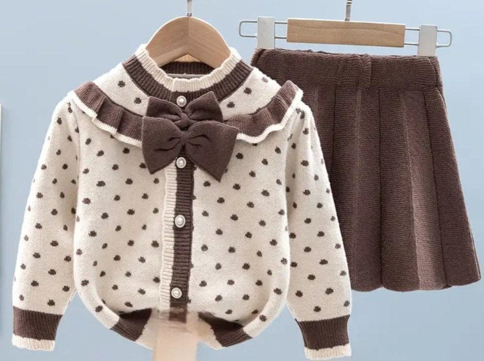 Kahverengi ve gri tonlarda puantiyeli, uzun kollu örgü bebek kız takımı. İnci düğmeli üst ve büyük fiyonk detaylı, uyumlu pantolonlu set.