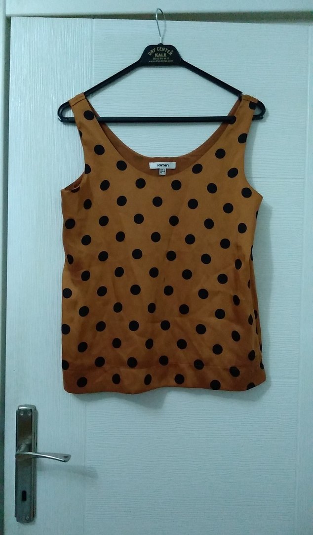 Kahverengi saten kumaş üzerine siyah puantiyeli, yuvarlak yaka, normal boy, salaş kesim kadın atlet.