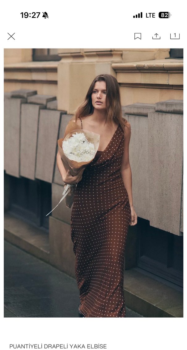 Kahverengi, puantiyeli, uzun, bol kesim, drapeli, askılı kollu, V yakalı, ipeksi kumaştan yapılmış elbise, düğünler için uygun.