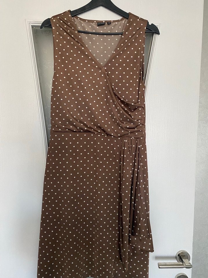 Kahverengi, beyaz puantiyeli, V yakalı, kolsuz, drapeli ve fitted kesim midi elbise, vintage bohem tarzı için uygun.