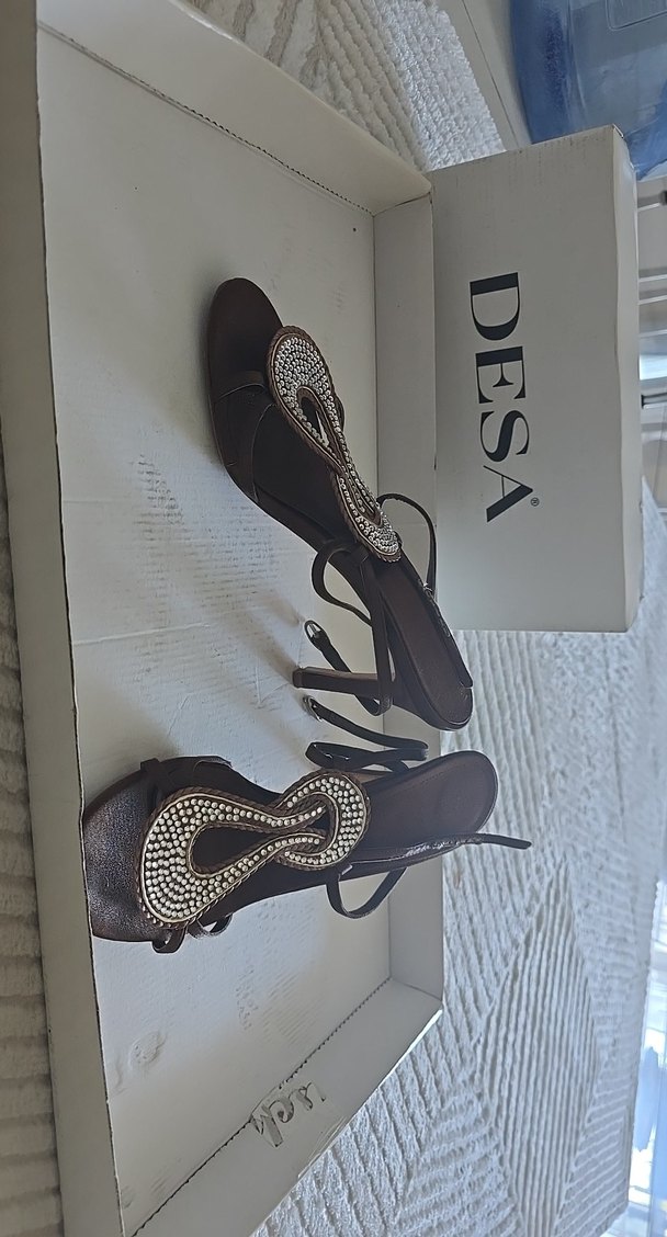 Kahverengi, tokalı stiletto topuklu ayakkabılar. Kauçuk malzemeden yapılmış, çağdaş ve göz alıcı tasarım. Romantik akşamlar için uygun. Marka: DESA.