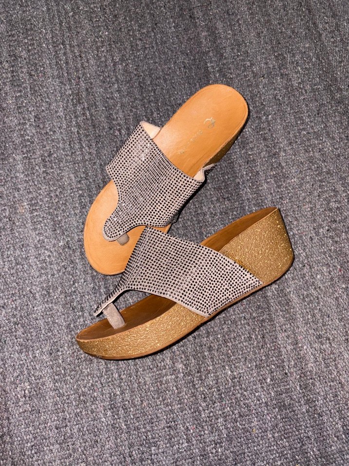 Kahverengi pul detaylı, dolgu topuklu terlikler. Günlük kullanıma uygun rahat ve şık.