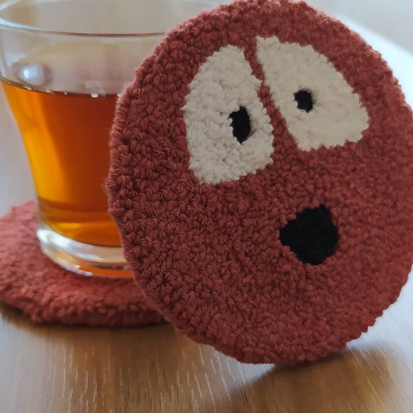 kahverengi ve renkli desenli punch barkak altlığı, eğlenceli yüz tasarımıyla. 2'li satılmaktadır. El yapımı