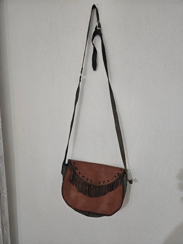 Nakışlı detaylar ve püsküllü kahverengi deri çanta, kemerli tasarıma sahip. Bohem tarz için günlük kullanıma uygun.