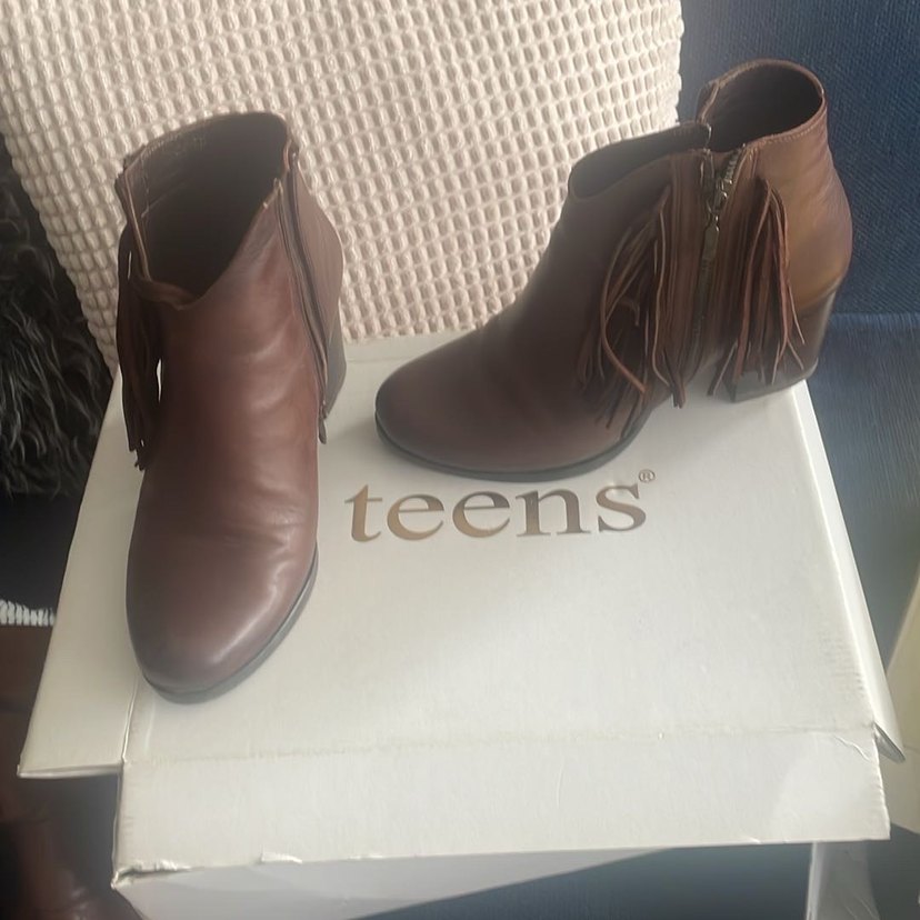 Kahverengi deri, hafif topuklu kadın botları, püskül detaylarıyla parlak bir görünüme sahip ve günlük bohem tarz için uygundur. ✨