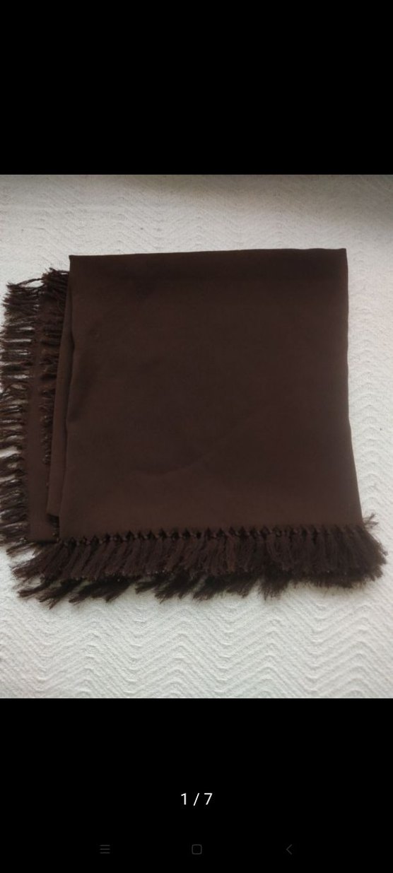 Kahverengi, püsküllü kenarları olan, yumuşak sentetik kumaştan yapılmış kadın şalı. Rahat ve bohem tarzda kullanıma uygundur.