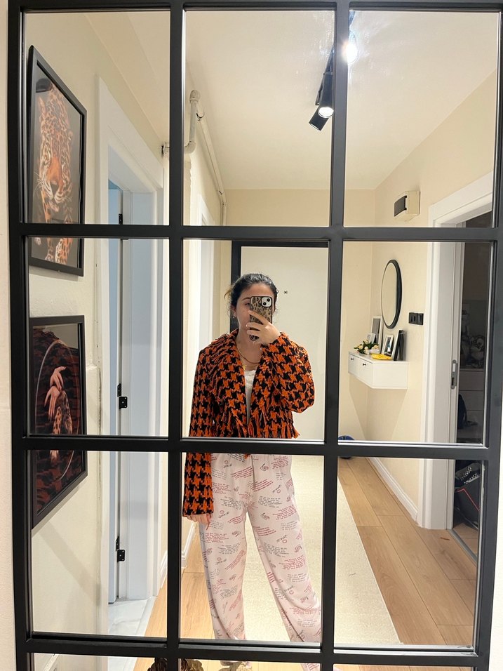 Düğmeli ve yakalı, püsküllü detaylara sahip kahverengi kısa kadın ceket. Uzun kollu ve vücuda oturan kesimiyle günlük kullanıma uygundur.
