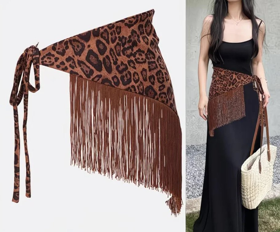 Kahverengi, koyu leopar desenli ve uzun püsküllü, yumuşak sentetik kumaştan bohem tarzda