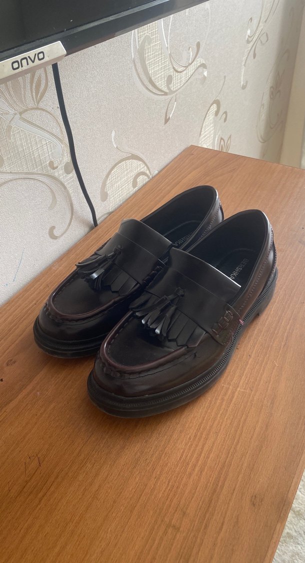 Kahverengi, püsküllü ve platform topuklu erkek loafer ayakkabılar. Kauçuk malzemeden yapılmış, klasik ve ofis kullanımı için uygun.