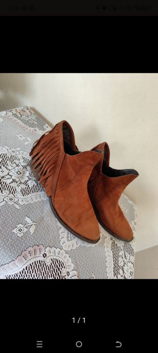 Kahverengi süet kadın botlar, dolgu topuk ve püskül detaylarıyla bohem tarzını yansıtır, günlük kullanıma uygundur.