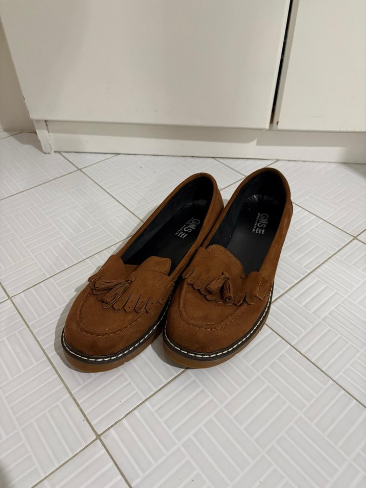 Kahverengi süet kadın loafer, blok topuklu ve püsküllü detaylıdır. Günlük kullanım ve sokak stiline uygundur. Parlak görünüme sahiptir.
