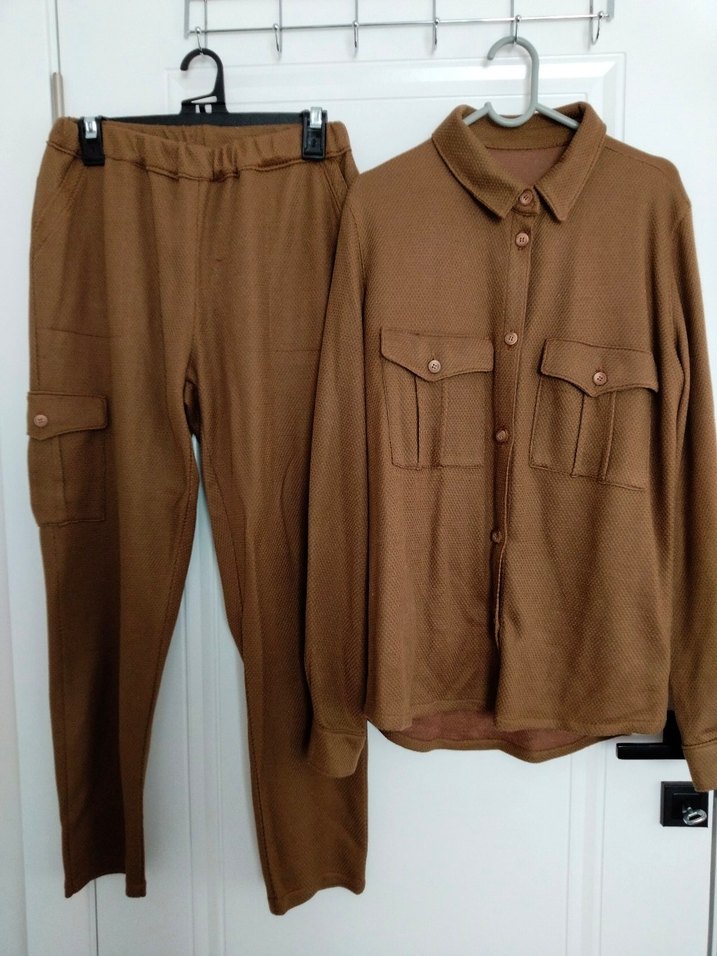 Düğmeli uzun kollu, kahverengi üst ve rahat kesim pantolonlu, yumuşak ve sıcak kumaştan kadın takımı. Özel dikimdir. Rahat kalıp