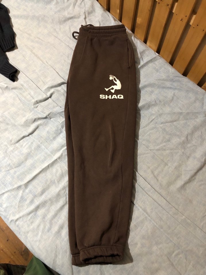 Kahverengi, rahat kesim kadın eşofman altı, fermuarlı cepler ve baskılı SHAQ logosuna sahip. Yumuşak kumaştan, sportif ve rahat bir tarz sunar. ön paçasında ufak lekeler var. Toplu alımlarda indirim yapıyorum.