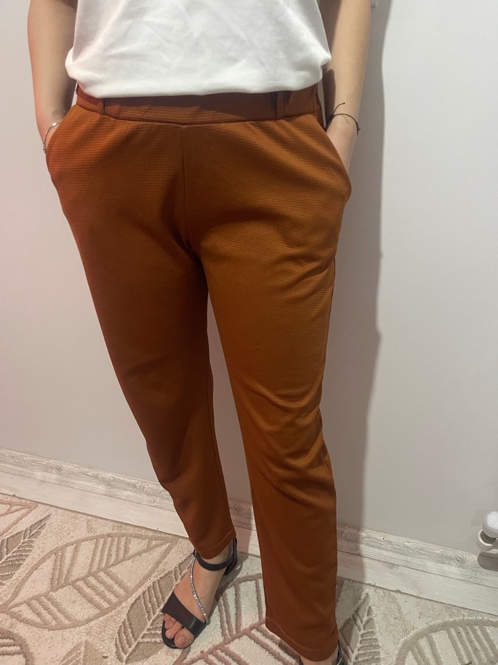Koyu kahverengi, rahat kesim midi boy kadın kumaş pantolon. Sentetik kumaştan, günlük kullanıma uygun, sokak tarzında şık ve rahat.