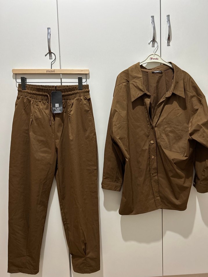 kahverengi, bol kesim . Uzun kollu, yakalı ve desensiz üst ile normal boy pantolon içerir. Rahat ve şık bir görünüm sunar.