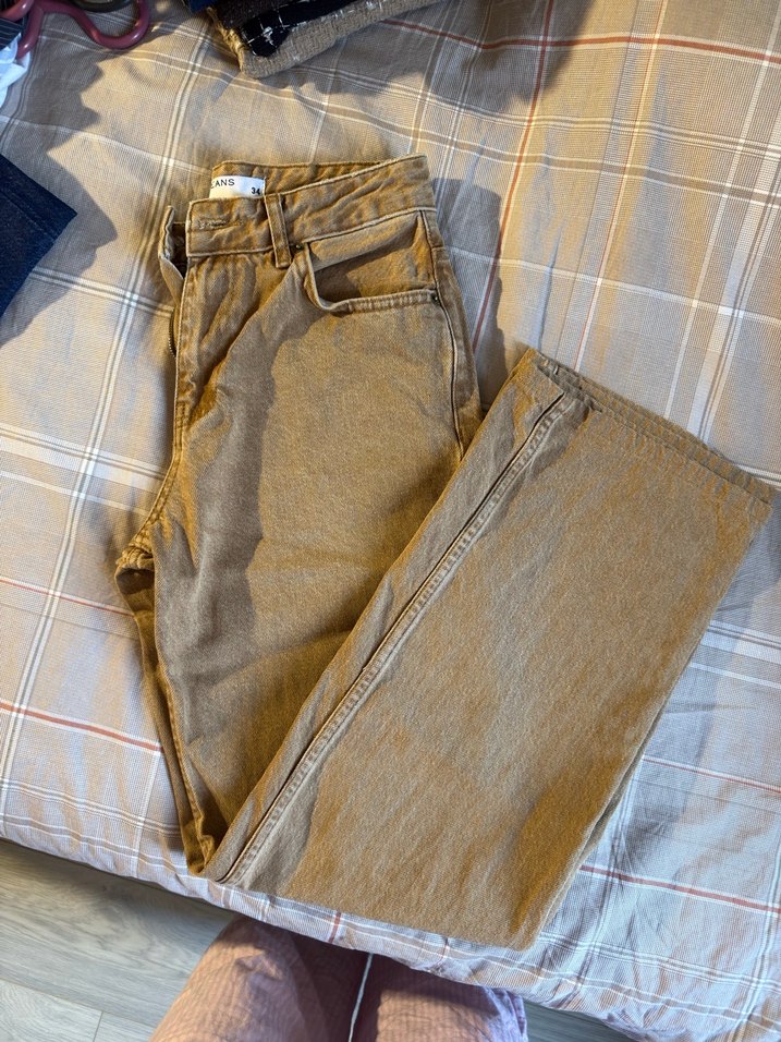 Kahverengi regular fit midi uzunlukta denim kumaştan, gündelik kullanıma uygun rahat ve şık kadın jean pantolon. Hardal rengi vintage pantolon