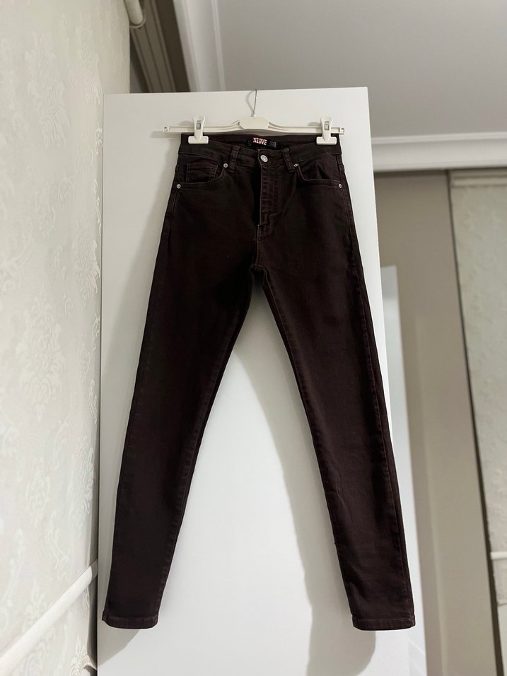 Koyu kahverengi denim kot pantolon, regular fit ve midi boyda. Günlük kullanım için rahat ve şık bir sokak stili sunar.