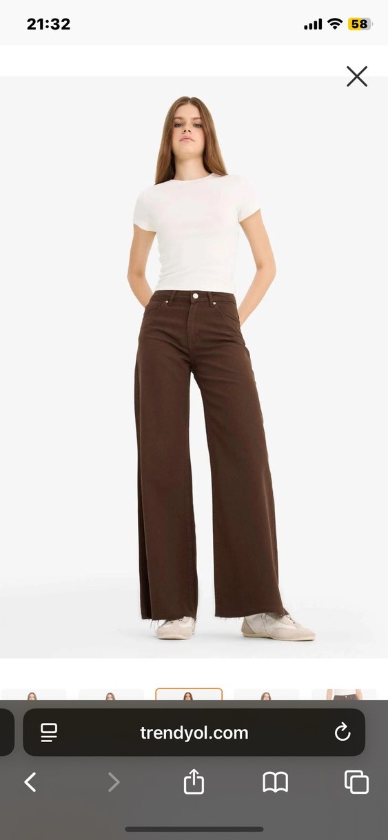 Koyu kahverengi, pamuklu, regular fit ve midi boy kot pantolon. Günlük kullanıma uygun, sade ve rahat bir tarz sunar.