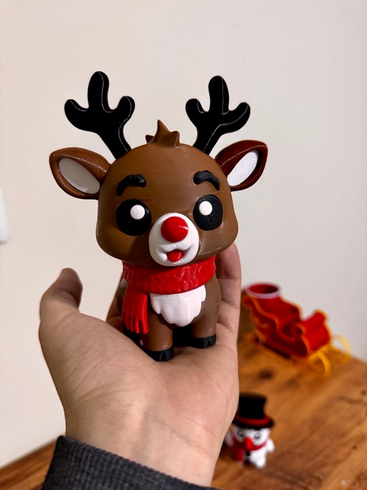 Kahverengi ren geyiği figüründe büyük gözler, siyah boynuzlar ve kırmızı atkı bulunur. Elinize sığacak büyüklüktedir.
