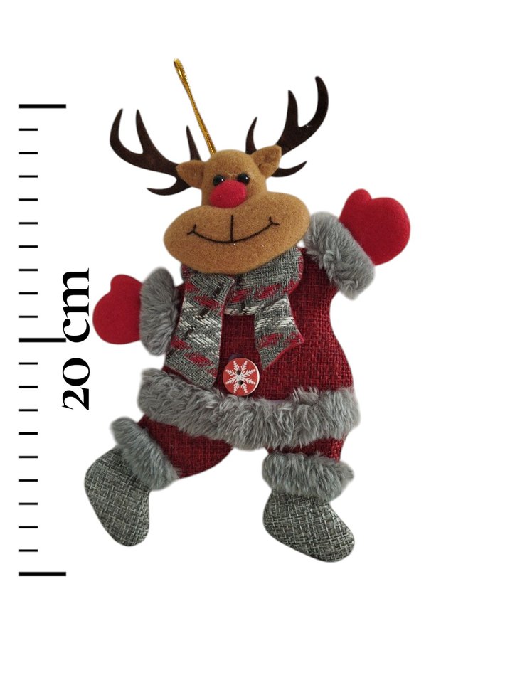 Kırmızı kıyafetli, gri kürk detaylı ve atkılı kahverengi renkli yılbaşı süsü geyik , yaklaşık 20 cm boyundadır ve asma ipi vardır.