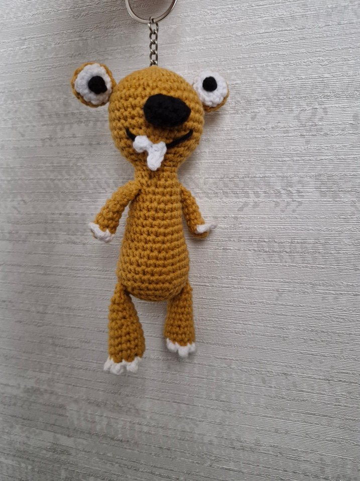 Renkli detaylara sahip, yumuşak örme dokulu kahverengi el yapımı sid anahtarlık.