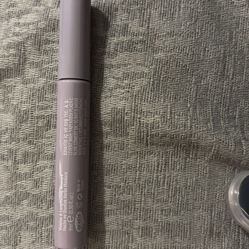 Bej renkte, hacim ve uzunluk sağlayan pürüzsüz aplikatörlü maskara. Gri tüp ambalajda sunulmuştur.